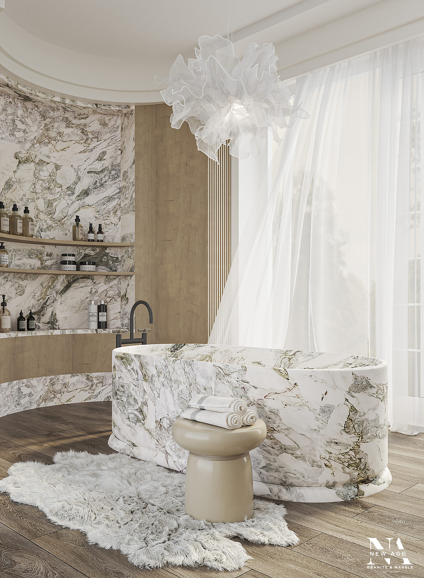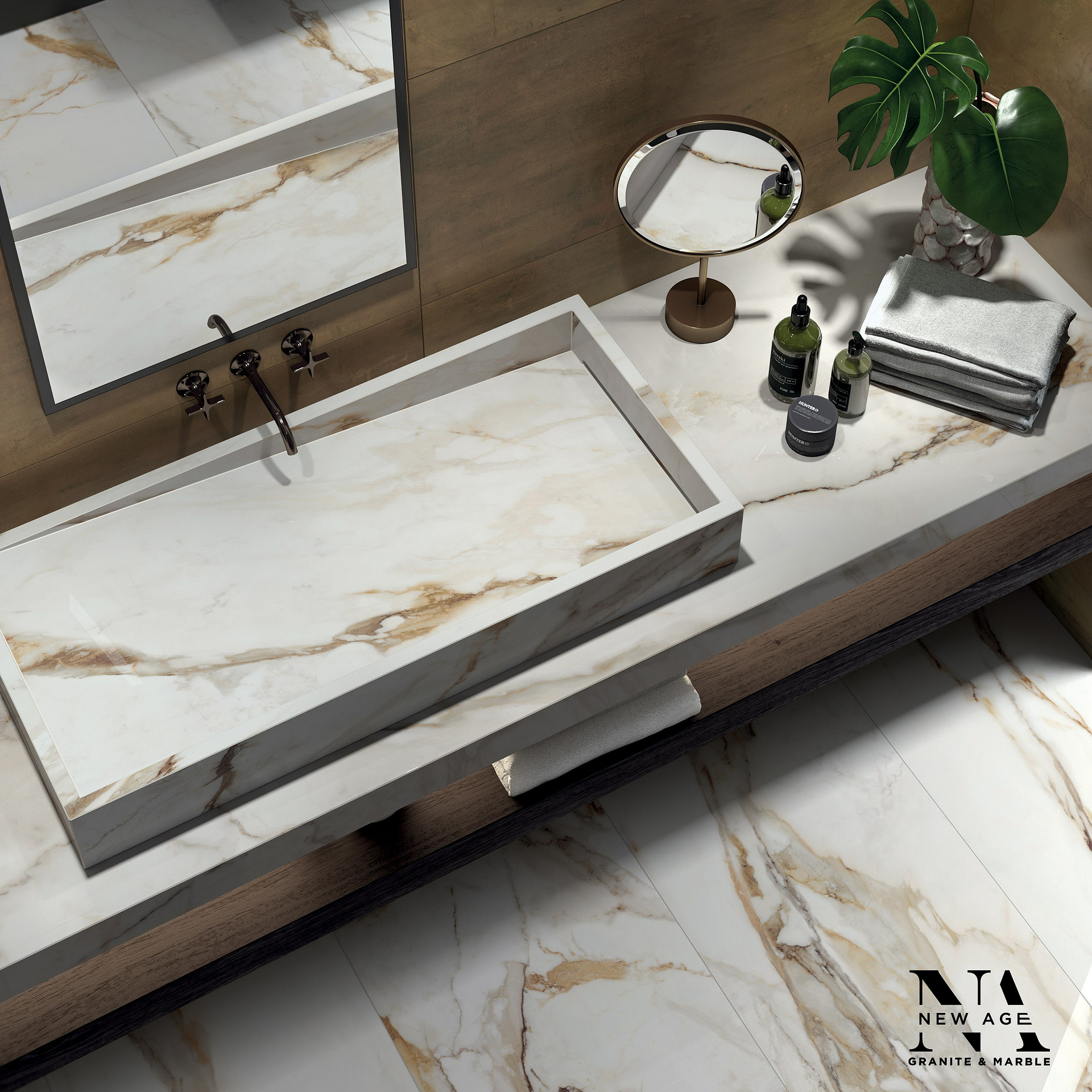 In this lavish bathroom, Capraia and Navona Honey Vein redefine opulence. Capraia exudes allure, while Navona Honey Vein adds natural beauty. Together, they create a sophisticated space, showcasing the versatile elegance of these surfaces for a luxurious and timeless retreat.