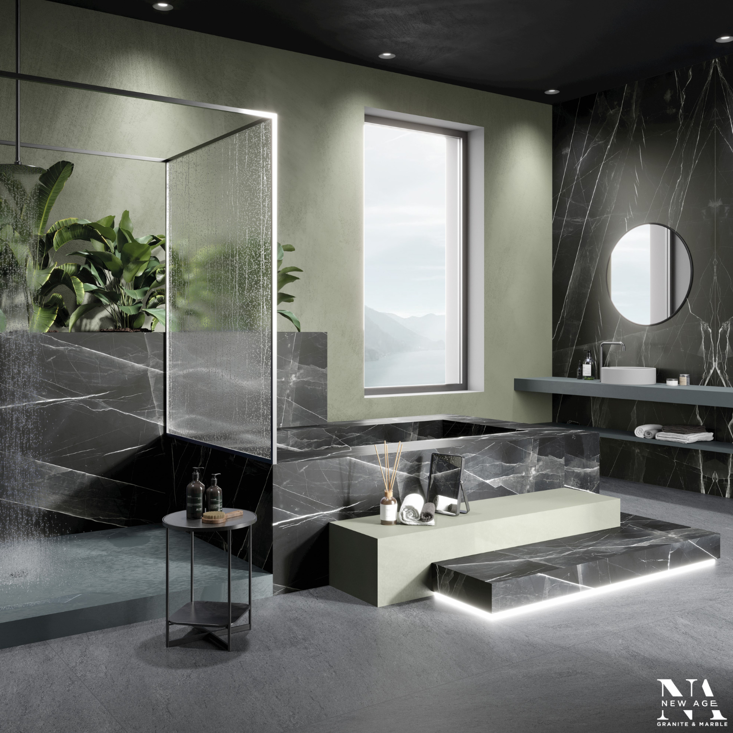 The Black Diamond porcelain, with its sleek black slab and striking white veining, transforms this bathroom into a space of contemporary allure. Its dramatic contrast creates a statement, infusing the room with a modern, luxurious ambiance.